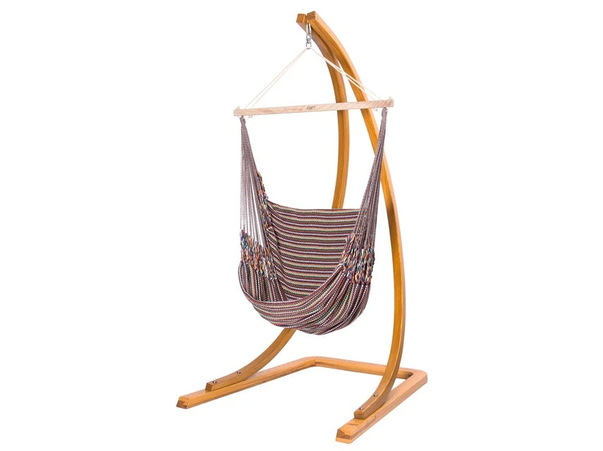 Das Baumwolltuch des Hängesessels misst 95×190 cm. Das Gestell ist aus Eschenholz hellbraun lasiert und schichtverleimt.