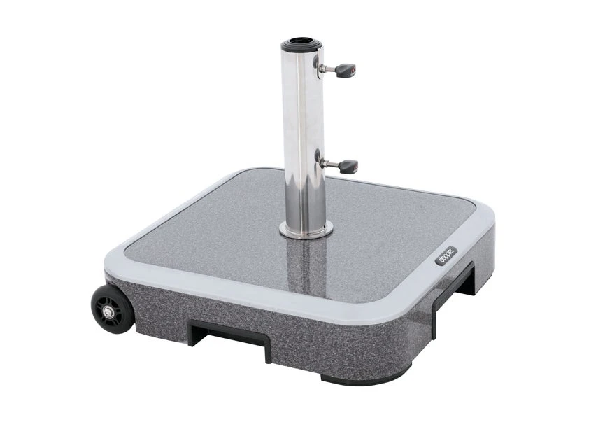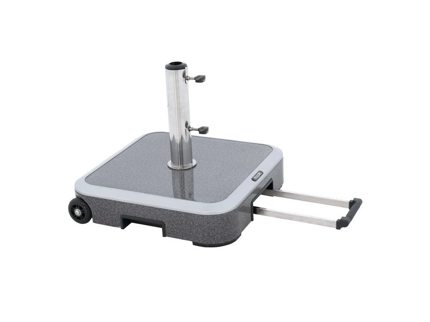 Die Platte des Schirmständers Expert besteht aus einem Betonsockel mit Alu-Hülle. Mit einem Gewicht von 50 kg ist er die ideale Ergänzung zu Ihrem Sonnenschirm und praktisch mit einem Trolleygriff und zwei Rollen beweglich. So wird der Schirm perfekt beschwert und hält jedem Wetter stand.