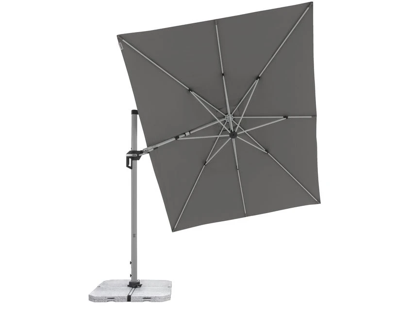 Das moderne Modell besteht aus einem Aluminiumgestell und einem anthrazitfarbenen Schirm aus Polyester mit 8 Stahlschienen.