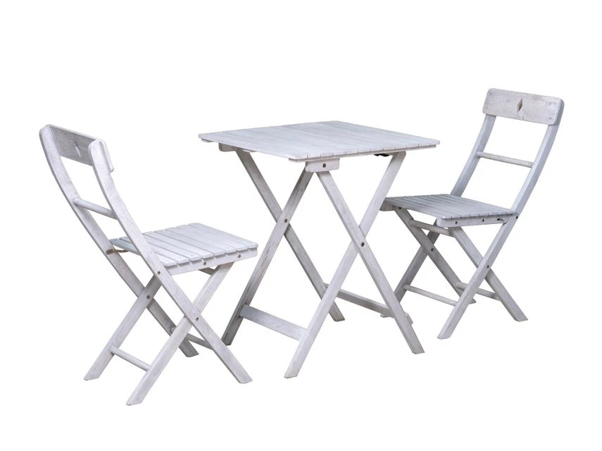 Das Gartenmöbel-Set Akazie ist eine ausgezeichnete Wahl, um zu entspannen und sonnige Tage im Freien zu genießen. Aus pulverbeschichtetem Akazien-Holz mit grauem Vintage-Finish hergestellt, präsentiert sich das 3-teilige Set robust und versprüht charmant den zeitlosen Landhausstil. Zum Set gehören zwei Stühle (38 x 51 x 82 cm) und ein Tisch (58 x 58 x 73 cm). Die Stühle und der Tisch lassen sich bequem zusammenklappen.