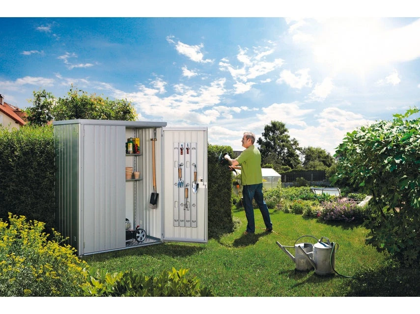 Ein Geräteschrank sollte auch in Ihrem Garten nicht fehlen. Hier sind Rasenroboter, Gartenwerkzeuge, Griller und vieles andere mehr optimal verstaut und vor der Witterung geschützt. Funktional, dezent und hochwertig verarbeitet ist der kompakte Geräteschrank 150 von Biohort. Aus feuerverzinktem Stahlblech mit Edelstahlscharnieren und -schrauben ist er extrem stabil, robust, regenwasserdicht und sogar sturmfest. Weitere tolle Extras sind die integrierte Durchlüftung und ein Drehgriff-Zylinderschloss, um alles sicher aufzubewahren.
