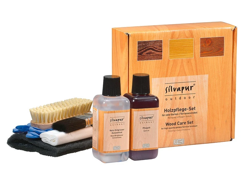 Vorfreude auf den Frühling? Dann bringen Sie rechtzeitig Sie Ihre Garten-, Balkon- und Terassenmöbel zum Strahlen! Das Holzpflegeset Silvapur bietet das Gesamtpaket zur Reinigung, zur Pflege und zum Schutz beanspruchter, vergrauter Hartholzmöbel im Außenbereich. Es ist perfekt geeignet für Teakholz sowie Hart- und Edelhölzer. Das 7-teilige Set umfasst einen Holzentgrauer ( 225 ml ), ein Pflegeöl (225 ml), eine Reinigungsbürste, ein Schleifvlies, Pflegetuch, einen Pinsel und 1 Paar Handschuhe sowie eine praktische Anleitung zur richtigen Reinigung.