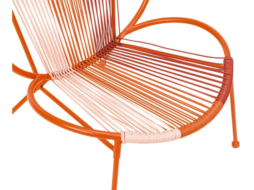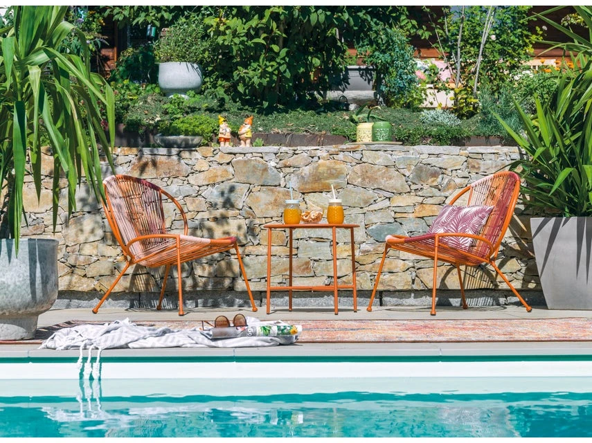 Ein Hauch von Vintage-Flair zieht mit dem 3-teiligen Balkonmöbel-Set Picardie im freundlichen Farbton Koralle bei Ihnen ein. Für Stabilität sorgt bei diesem optisch filigran wirkenden Set ein Gestell aus Stahl. Die Seilbespannung der Sessel aus Kunststoff ist pflegeleicht und verspricht Langlebigkeit. Zum Set gehören zwei Sessel (64,5 x 76 x 74,5 cm, Sitzhöhe vorne 38 cm – hinten 27 cm) und ein runder Beistelltisch (50 x 45 cm).Bei einer Tasse Kaffee oder einem kühlen Drink genießen Sie hier entspannte Stunden im Freien. Unser Modell Picardie verkörpert charmant den angesagten Retro-Chic und wird Sie begeistern!