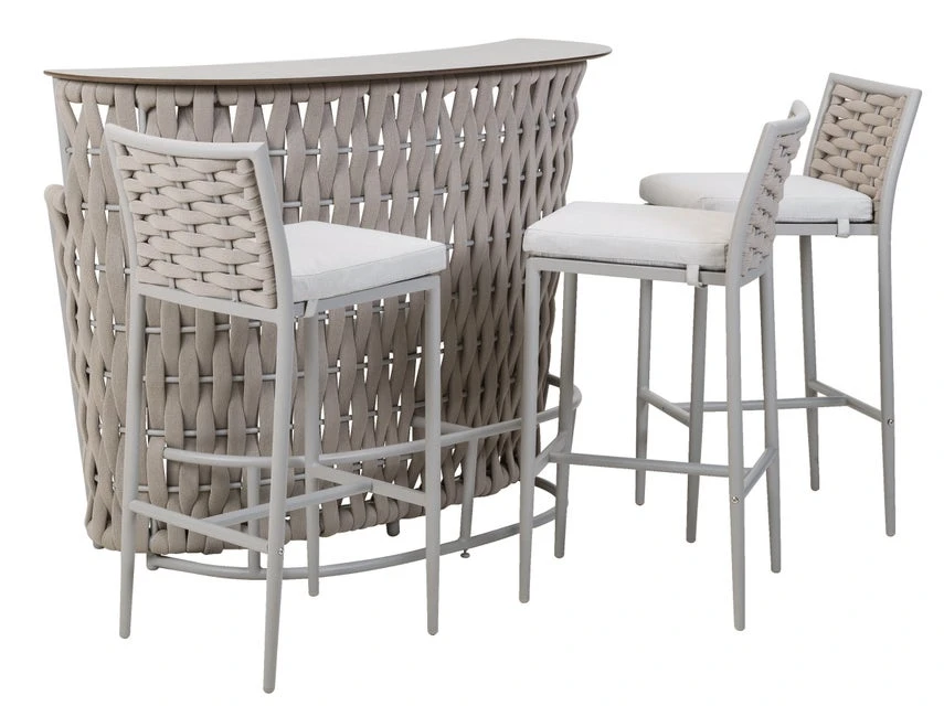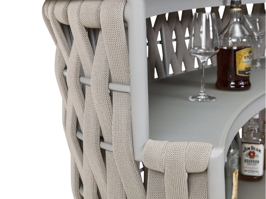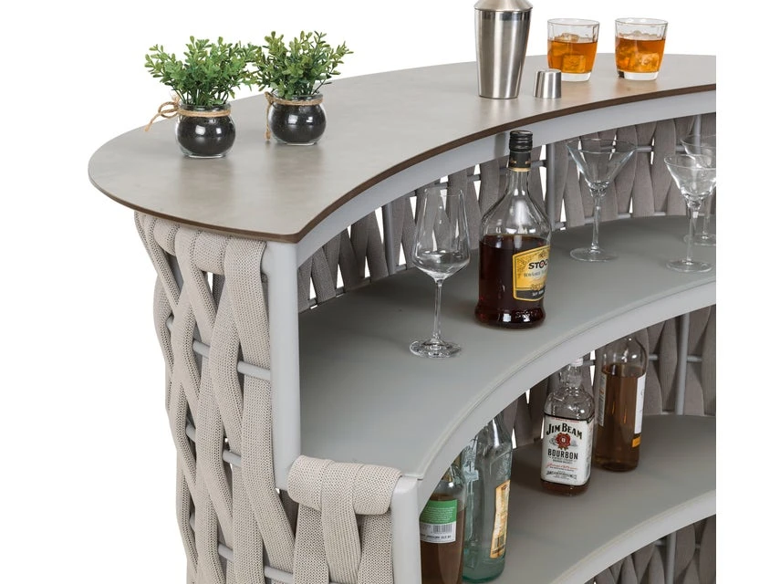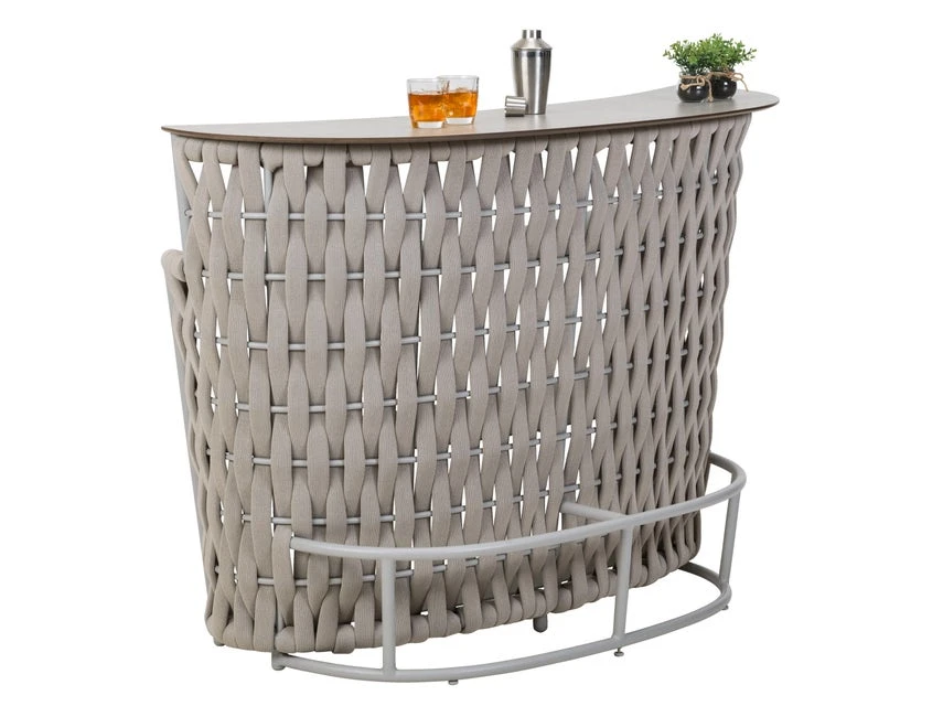 Ein kühles Erfrischungsgetränk oder ein fruchtiger Cocktail gefällig? Dann ist die Bar Bretagne aus hochwertigem Kunststoffgeflecht genau der richtige Platz dafür. An der Vorderseite sorgen bequeme Fußstützen für Komfort und an der Rückseite finden auf drei Ablageflächen, Flaschen, Gläser und andere Barutensilien ihren Platz. Mit diesem einzigartigen Gartenmöbel lassen sich entspannte Sommerabende auf Balkon und Terrasse so richtig genießen!