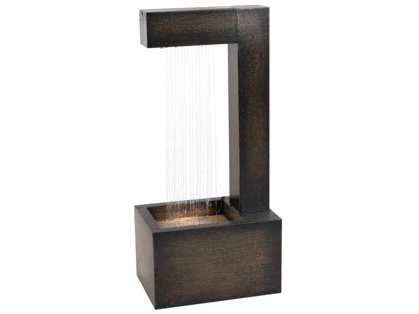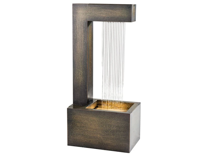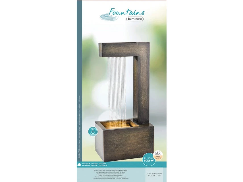 Brunnen sind mehr als nur dekorative Elemente. Mit dem sanftem Rauschen des Wassers und stimmungsvollen Licht schenken sie auch entspannende Momente. Bei diesem Modellsorgen das zeitlos modernem Design aus grün-goldfarbenem Eisen und der kleine Wasserfall für eine besondere Attraktion im Garten, auf dem Balkon oder der Terrasse. Die Wohlfühlatmosphäre wird perfekt, wenn die vier spritzwassergeschützten LEDs mit warmweißen Licht die passende Beleuchtung liefern. Praktische Details des bezaubernden Brunnens sind die Abschaltautomatik und 10 Meter lange Zuleitung.