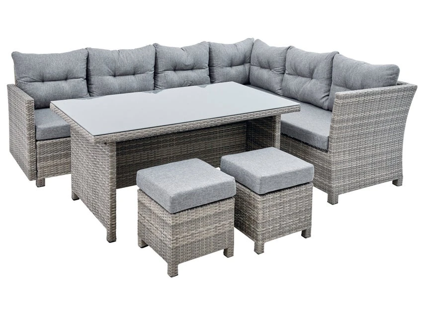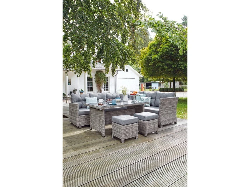 Entspannung pur in gemütlicher Runde lautet das Motto des hochwertigen 5-teiligen Gartenmöbel-Sets Amrum. Das strapazierfähige Kunststoffgeflecht verkörpert den modernen Landhausstil perfekt. Zum Set gehören eine 2er Bank (170 x 78 x 75 cm), eine 3er Bank (205 x 78 x 75 cm, Rückenlehnenhöhe 78cm), zwei Hocker (je 40 x 45 x 40 cm) und ein Tisch (145 x 68 x 85 cm, Tischunterkante 63 cm). So richtig bequem wird es durch die mitgelieferten, weich gepolsterten Sitz- und Rückenkissen (Sitzhöhe ohne Kissen 34 cm, mit Kissen 44 cm). Machen Sie mit unserem gemütlichen Modell Amrum Ihre Terrasse zum zweiten Wohnzimmer im Freien!