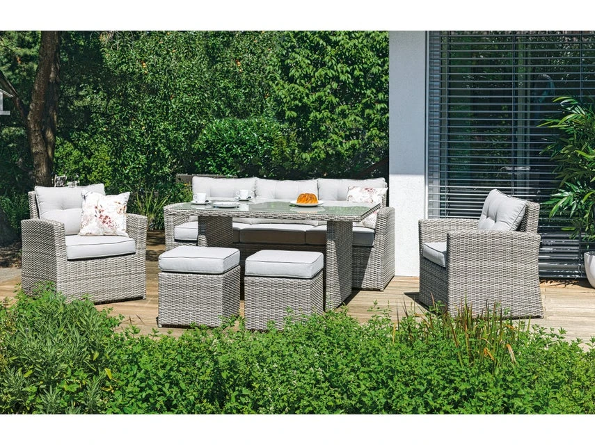 Moderner Landhaus-Flair zieht mit dem 6-teiligen Gartenmöbel-Set Barcley bei Ihnen ein. Zum Set gehören zwei Fauteuils (68 x 78 x 76 cm, Armlehnenhöhe 61,5 cm), eine 3-er Bank (182,5 x 78 x 76 cm), zwei Hocker (44 x 36 x 44 cm) und ein Tisch (140 x 71 x 85 cm). Für angenehmen Sitzkomfort sorgen weiche Sitz- und Rückenkissen (Höhe 10 cm). Einem gemütlichen Beisammensein mit der Familie steht mit dieser schicken Gartenmöbelkombi auf der Terrasse und im Garten nichts mehr im Wege!