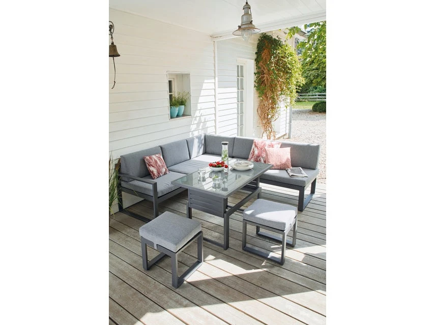 Das moderne Gartenmöbel-Set Lina könnte auch in Ihrem Garten bald ein gemütlicher Treffpunkt für die ganze Familie sein. Zum Set gehören eine 2-teilige Eckbank (213 x 198 cm, NICHT seitenverkehrt montierbar), zwei Hocker (je 39 x 34 x 39 cm) und ein höhenverstellbarer Tisch (120 x 44-67,5 x 65 cm). Bequemen Sitzkomfort bieten die mitgelieferten, weichen Sitz- und Rückenkissen, Armlehnen (Höhe 56 cm) sowie eine Verstellfunktion an der 3-er Bank (Sitzhöhe ohne Kissen 34 cm, mit Kissen 43 cm).