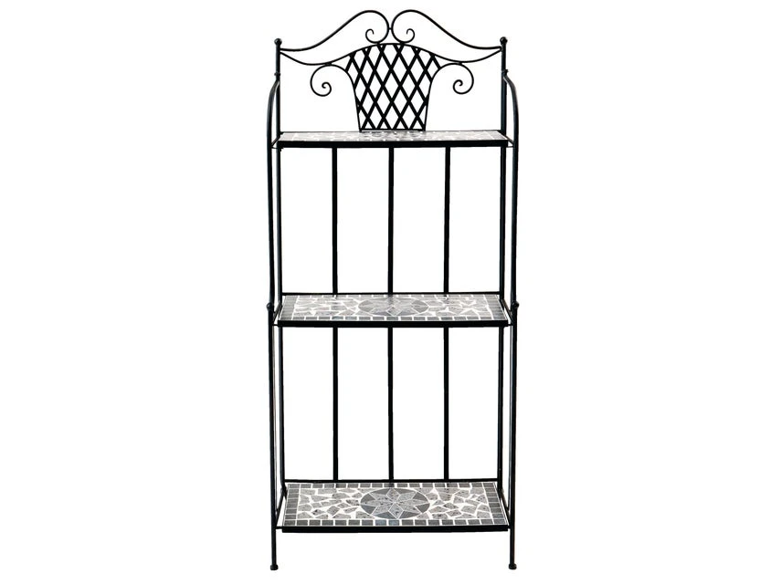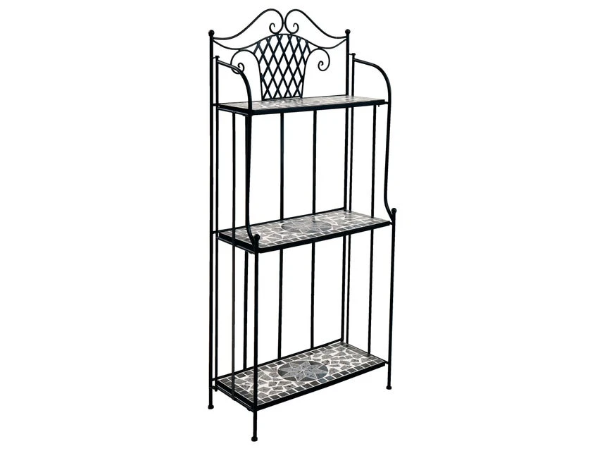 Mit seinem romantischen Stil macht das Gartenregal Rosi die Freiluftsaison richtig perfekt. Es ist kunstvoll aus schwarzem Schmiedeeisen gefertigt und bringt einen Hauch Retro und Sommerromantik ins Grüne. Die in den Regalböden eingesetzte, grauen Mosaikfliesen mit klassischem Sternmotiv sorgen zusätzlich für einen stimmungsvollen Blickfang. Zudem ist es einfach transportabel, denn es ist klappbar.