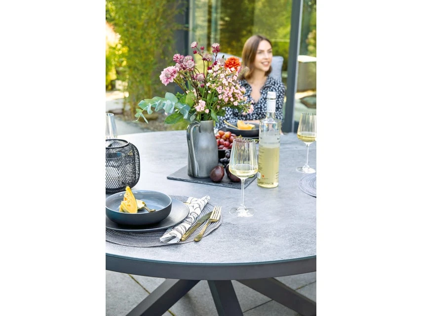 Mit dem runden Gartentisch Bondino holen Sie sich ein trendiges Möbelstück für Ihre Terrasse und den Garten! Seine 3D Tischplatte aus elegantem Glas harmoniert perfekt mit dem stabilen Aluminiumgestell in der Farbe Anthrazit. Der perfekte Platz für ein gemütliches Beisammensein im Freien.