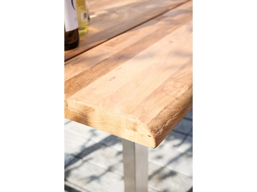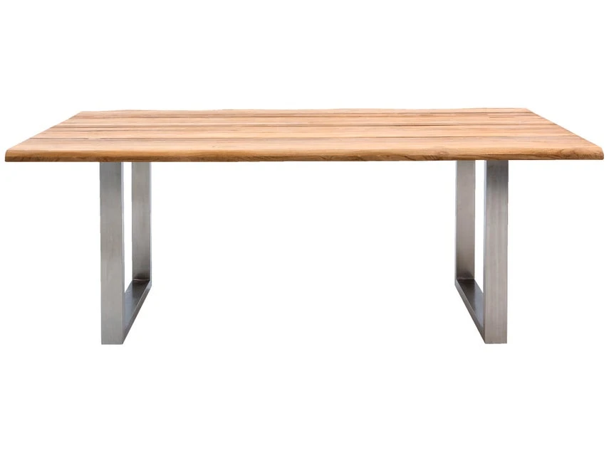 Individuelle Holzmaserung und die natürliche Kante der Tischplatte aus Teakholz verleihen dem Gartentisch Green Bay eine rustikale, wohnliche Optik. Dazu schafft das Kufengestell aus silberfarben glänzendem Edelstahl einen modernen Stilbruch. Diese Kombination zieht die Blicke auf sich und lädt ein Platz zu nehmen um entspannte Stunden im Garten zu verbringen.
