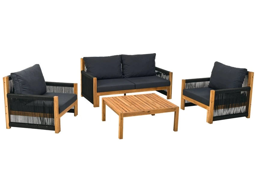 2x Fauteuil B 80 x H 72 x T 75 cm, 2er Bank B 150 x H 72 x T 75 cm, Loungetisch 85 x 75 x H 75 cm, 4x Sitzkissen und 4x Rückenkissen, Sitzhöhe ohne Kissen 35 cm, mit Kissen 50 cm
