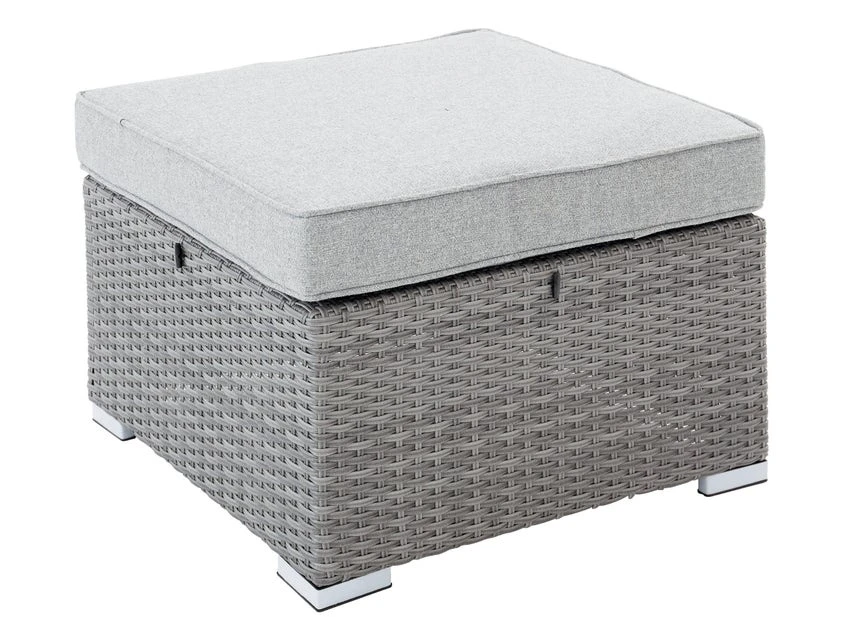 Mit dem wanderlbaren Loungetisch Rügen aus einem Aluminiumgestell mit einem Kunststoffgeflecht ummantelt und einer Glasplatte ausgestattet, verwandeln Sie diesen im Handumdrehen zu einem bequemen und großzügigen Hocker. Mitgeliefert wird dafür auch das praktische Sitzkissen (66x10x66 cm).
