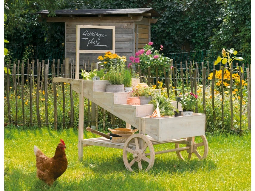 Gestalten Sie mit der Pflanzkarre Plantaro Ihren neuen Lieblingsplatz im Garten! Dafür sprechen die bezaubernde Optik und die dazugehörige Keidetafel, die man nach Herzenslust beschriften kann. Durch den nostalgischen Charme wird die zweirädrige Karre aus gebleichtem Tannenholz zum absoluten Blickfang und der naturbelassene Look ist die ideale Bühne für bunte Blumen, Grünpflanzen und Kräuter. Hübsche Töpfe, Gefäße und andere Accessoire finden auf den treppenartig angeordneten Ablageflächen reichlich Platz. Damit schenkt Plantaro grünen Oasen gemütliches Landhaus-Flair.