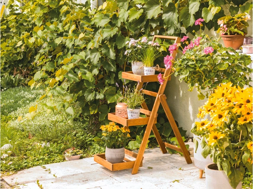 Das Gartenregal Rheia macht die Freiluftsaison noch etwas schöner. Denn sein natürlicher Charme wird Pflanzenfreunde ebenso begeistern wie Fans von Naturmaterialien. Rheia ist liebevoll aus geöltem Akazienholz gefertigt und inmmitten von üppigem Grün ein stimmungsvoller Anblick – sommerlich dekoriert mit hübschen Blumentöpfen und Accessoires, die auf den drei Ebenen Platz finden. Besonders praktisch: Das Regal von Jardini ist klappbar und damit leicht zu transportieren.
