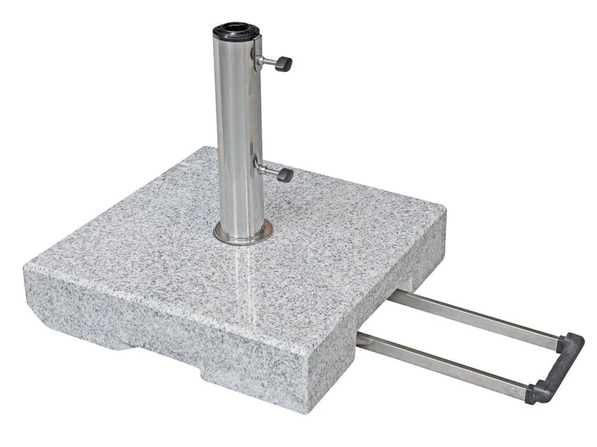 Nützliche Schattenspender sind Sonnenschirme und natürlich darf auch das Zubehör nicht fehlen, sowie der Schirmsockel aus Granit in Kombination mit Edelstahl silber. Der 50 kg schwere Sockel ist mit einem Trolleygriff und 2 Rädern ausgestattet somit kann dieser leichter bewegt und transportiert werden.