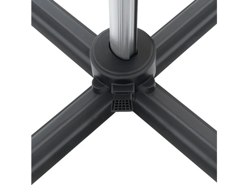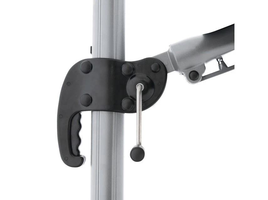 Das moderne Modell besteht aus einem Aluminiumgestell in silber und einem anthrazitfarbenen Schirm aus Polyester mit 6 Stahlschienen.