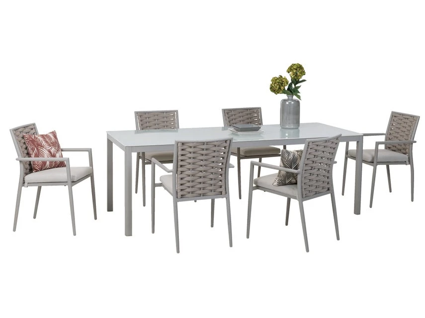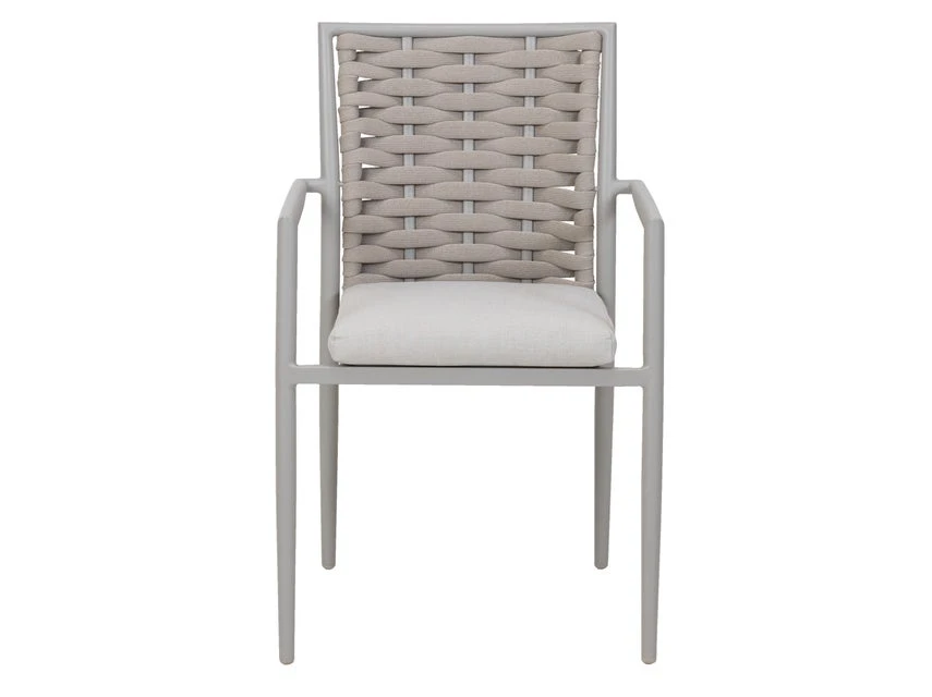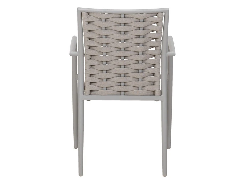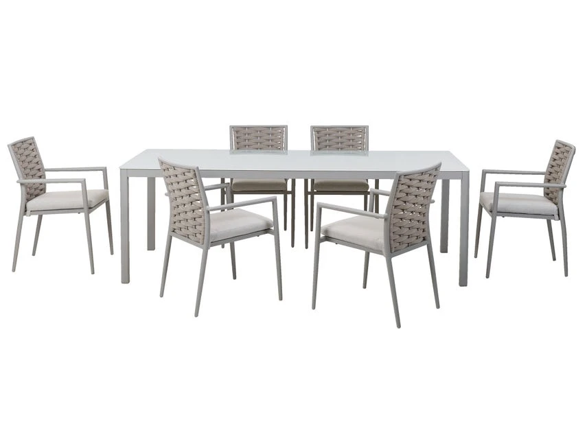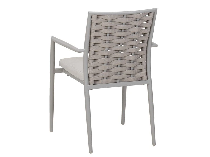 Das Gestell aus Aluminium mit Kunststoffgeflecht in Grau ummantelt wird inklusive Kissen in Polyester Anthrazit geliefert.