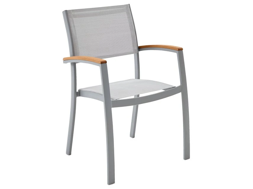 Mit dem Stapelsessel Sylt erhalten Sie eine komfortable Sitzgelegenheit im modernen Design. Das Aluminiumgestell in grauer Optik und der Platinfarbener Bezug aus Textil in Kombination mit den Armlehnen aus Eukalyptus in Teakoptik lackiert runden das Design perfekt ab.