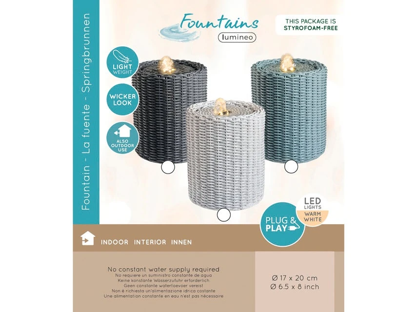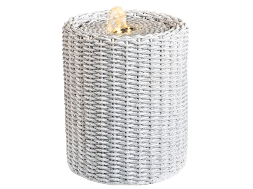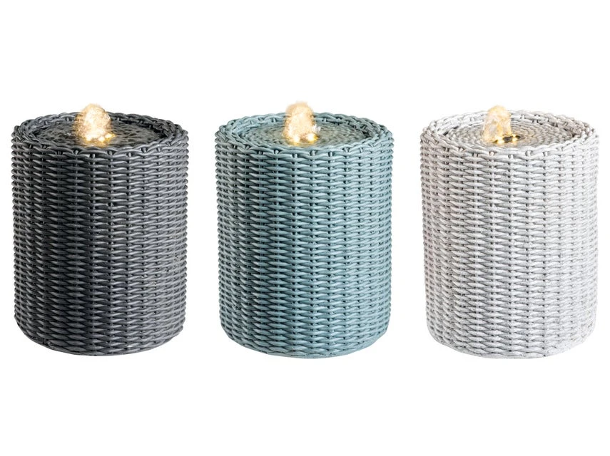 Schmucke Weidenkörbe standen Pate für diesen dekorativen Tischbrunnen von Jardini. Seine kunstvolle Flechtoptik ist aus Polyresin perfekt nachgebildet und vier spritzwassergeschützte, warmweiße LEDs kreieren eine stimmungsvolle Lichtatmosphäre. Der leichte Tischbrunnen passt wunderbar zu Balkon- und Gartenmöbeln im Landhaus- sowie Toskana-Stil und bezaubert auch indoor. Er ist in drei dezenten Naturtönen in Hellgrau, Grün und Anthrazit in unseren Einrichtungshäusern erhältlich.