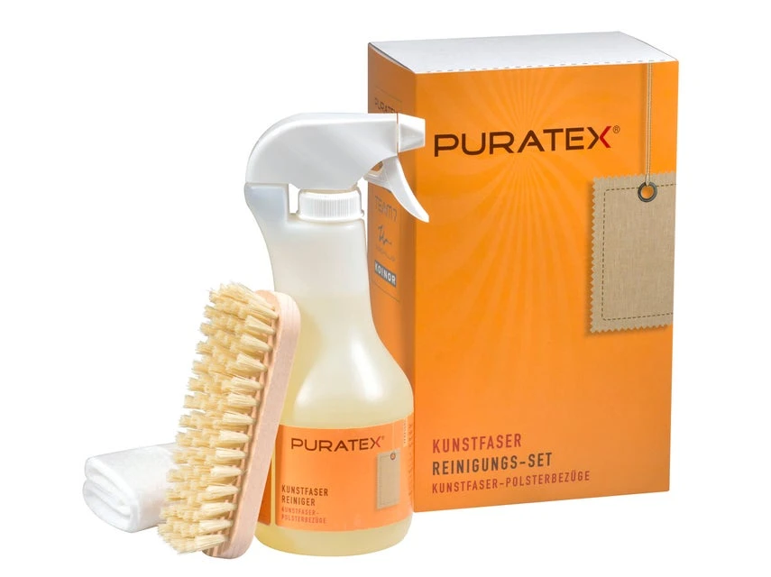 Bringen Sie Ihre textilen Oberflächen aus Kunstfaser mit dem Reinigungsset Puratex wieder auf Vordermann. Es besteht aus einem Reinigungsmittel in einer Pumpsprühflasche (500 ml), einer praktischen Bürste und einem Tuch. Damit entfernt es Flecken und Verschmutzungen, etwa von Speisen und Getränken oder leichten Jeansabfärbungen.