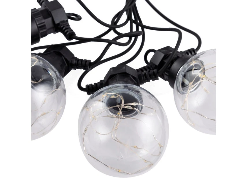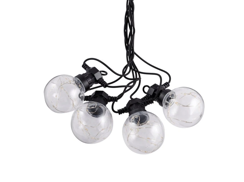 Für die richtige Stimmung bei Partys, Festen und anderen schönen Anlässen sorgt die LED-Lichterkette Almaga. Die schlichte schwarze Kette mit klaren Kunststoffkugeln ist als Dekoration immer passend. Ingesamt zehn LED-Leuchtmittel zaubern mit warmweißem Licht eine tolle Atmosphäre. Da sie spritzwassergeschützt ist, eignet sich die Lichterkette ideal für draußen.