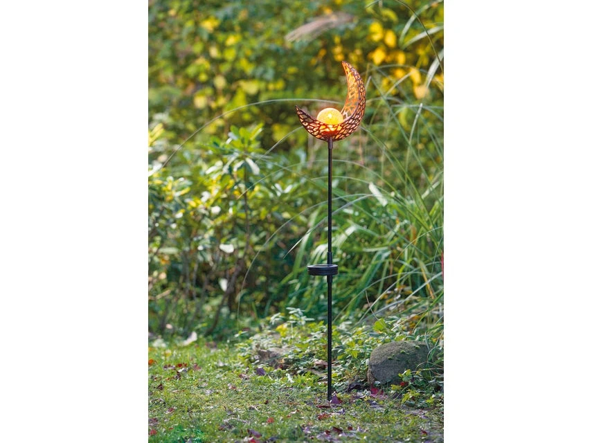 Einen Hauch orientalisches Flair verleiht die Solarleuchte Sol-Cil Ihrem Garten oder Ihrer Terrasse! Das fantasievolle Design und das durchbrochene Muster des halbmondförmigen Schirms in Schwarz-Gold schaffen reizvolle Effekte. Im Gegensatz zu manch anderen Solarlampen kann man das 90 cm hohe Standmodell beliebig ein- und ausschalten. Dann taucht die Leuchtkugel mit Krakeleemuster Ihre Outdoor-Oase in zauberhaftes, bernsteinfarbenes Licht. Voll aufgeladen beträgt die Leuchtdauer des wetterfesten Modells laut Hersteller etwa acht Stunden.