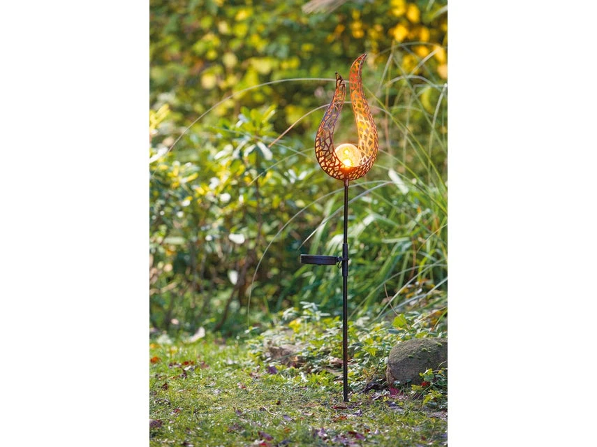 Einen Hauch orientalisches Flair verleiht die Solarleuchte Sol-Cil Ihrem Garten oder Ihrer Terrasse! Die fantasievoll geschwungene Flammenform und das durchbrochene Muster des Schirms in Schwarz-Gold schaffen reizvolle Effekte. Im Gegensatz zu anderen Solarlampen kann man das 90 cm hohe Standmodell beliebig ein- und ausschalten. Dann taucht die Leuchtkugel mit Krakeleemuster Ihre Outdoor-Oase in ein zauberhaftes, bernsteinfarbenes Licht. Bei voller Aufladung beträgt die Leuchtdauer des wetterfesten Modells laut Hersteller etwa acht Stunden.