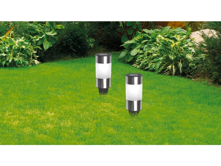 Gleich drei auf einen Streich gibt es mit dem Solarleuchtenset Solar von Globo. Die aus robustem Edelstahl gefertigten, 24 cm hohen Solarspieße sind spritzwassergeschtützt und somit perfekt im Outdoorbereich einsetzbar. Sie werden einfach in den Erdboden gesteckt und sorgen mit 0,06 Watt starken LEDs hinter einem satinierten Kunststoffschirm für erhellte Wege, Eingänge und Bereiche im Garten. Die eingebauten Batterien haben eine Leuchtdauer von bis zu 8 Stunden.