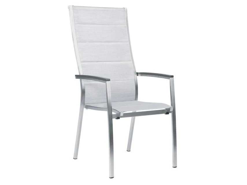 Der stapelbare Gartensessel Cardiff mit hoher Rückenlehne präsentiert sich elegant und edel durch sein Edelstahlgestell und den silberfarbenen leicht gepolsterten Textilbezug. Das Modell hat alles für einen stilvollen Outdoorbereich zu bieten.