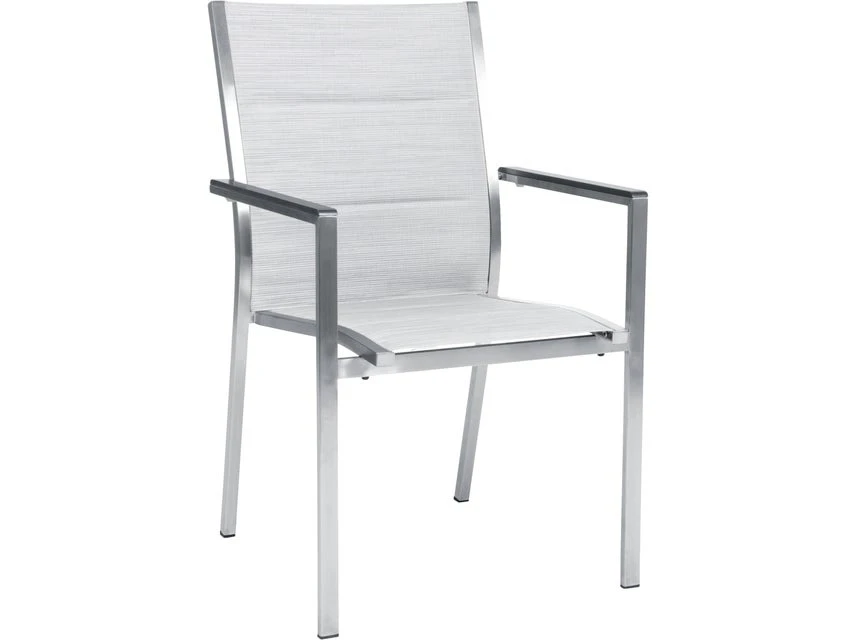 Der stapelbare Gartensessel Cardiff präsentiert sich elegant und edel durch sein Edelstahlgestell und den silberfarbenen leicht gepolsterten Textilbezug. Das Modell hat alles für einen stilvollen Outdoorbereich zu bieten.