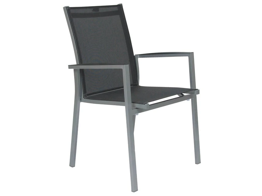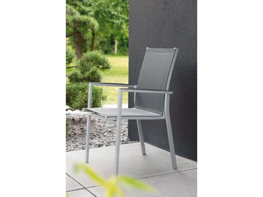 Mit dem Stapelstuhl erhalten Sie eine komfortable Sitzgelegenheit. Das Aluminiumgestell in graphit dieses Gartensessels ist mit einem Textilbezug in silbergrau bespannt und mit angenehmen Armlehnen ausgestattet.