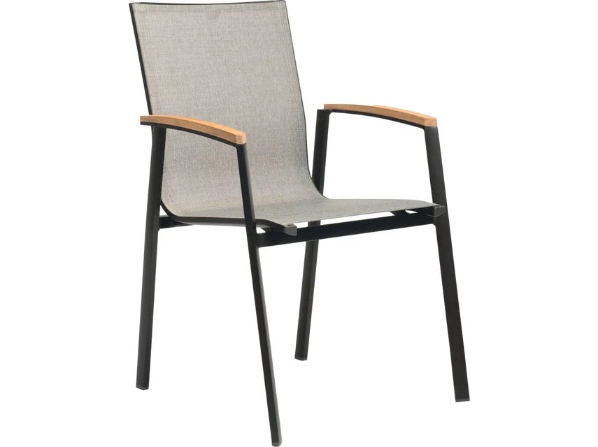 Mit dem Stapelstuhl erhalten Sie eine komfortable Sitzgelegenheit. Das Aluminiumgestell in schwarz matt dieses Gartensessels ist mit einem Textilbezug in der Farbe grau bespannt und mit angenehmen Armlehnen ausgestattet.